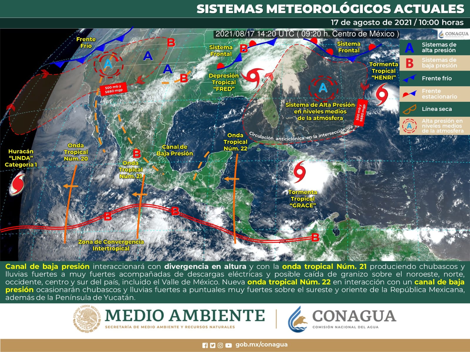 Además de la presencia de un canal de baja presión se da seguimiento a la trayectoria de la tormenta "Grace" en el Caribe que a partir del miércoles puede afectar